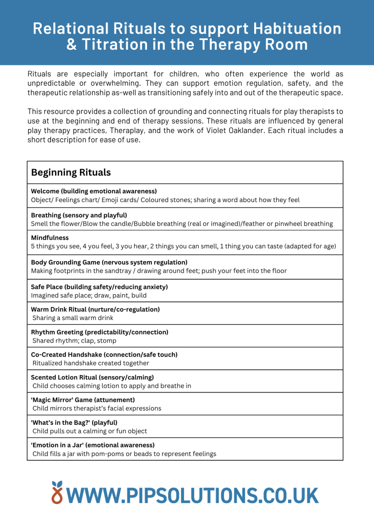 Rituals are especially important for children, who often experience the world as unpredictable or overwhelming. This resource provides a collection of grounding and connecting rituals for play therapists to use at the beginning and end of therapy sessions. These rituals are influenced by general play therapy practices, Theraplay, and the work of Violet Oaklander.
