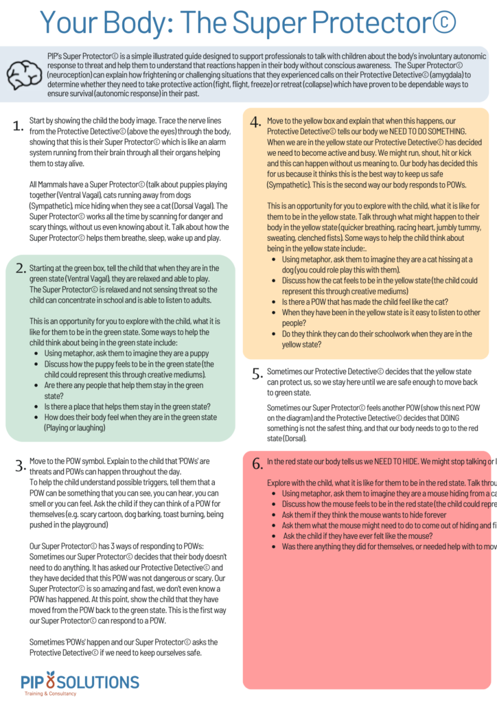 Your Body: The Super Protector© is a simple illustrated guide designed to support professionals to talk through the body’s involuntary autonomic response to threat with children, young people and their parents.